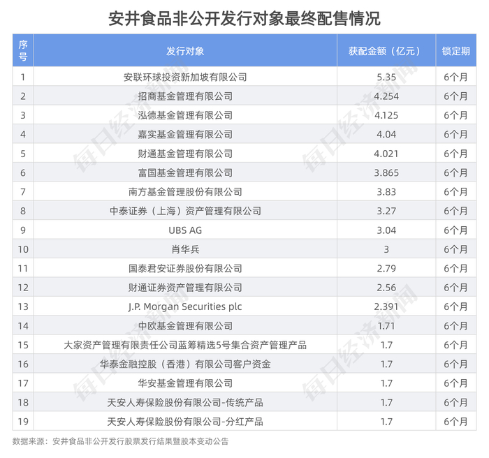 今年3月,速冻龙头安井食品(603345,SH)定增落地,上市公司以116.08元/股的价格向19名发行对象非公开发行4888.49万股股票,募得资金56.75亿元。