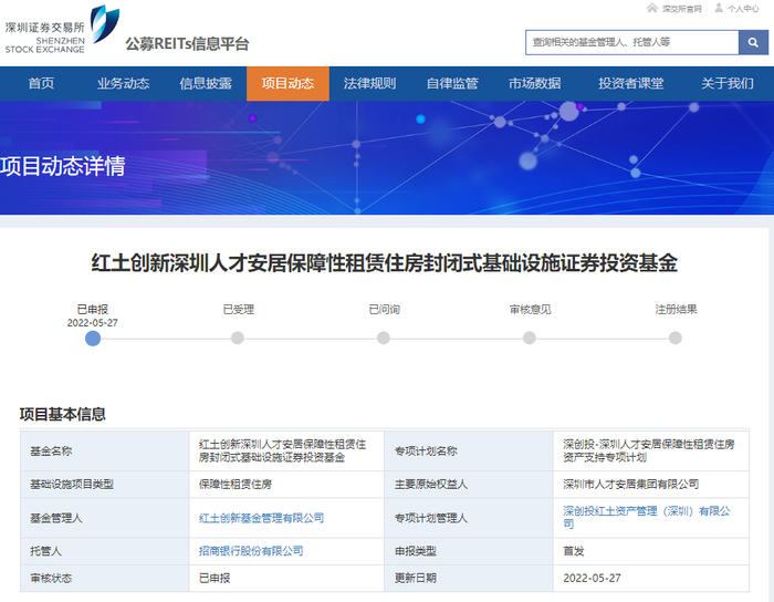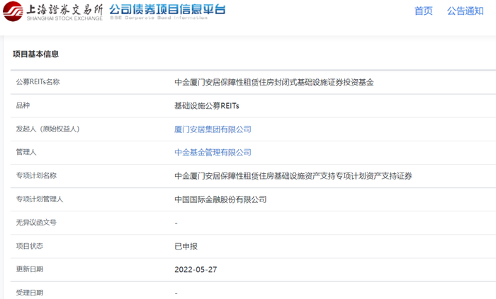 5月27日,证监会办公厅与国家发展改革委办公厅联合发布了《关于规范做好保障性租赁住房试点发行基础设施领域不动产投资信托基金(REITs)有关工作的通知》。同日,深圳市人才安居集团有限公司、厦门安居集团有限公司REITs项目分别正式报送深圳证券交易所和上海证券交易所,成为全国首批正式申报的保障性租赁住房REITs项目。