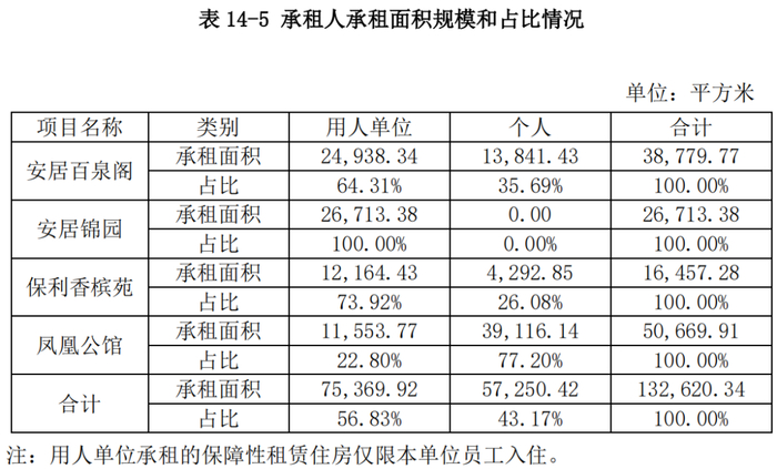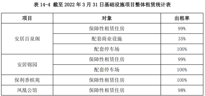 截至 2022 年 3 月 31 日,安居百泉阁项目、安居锦园项目、保利香槟苑项目和凤凰公馆项目保障性租赁住房的出租率分别为 99%、99%、100%和 98%。具体出租数据情况如下: