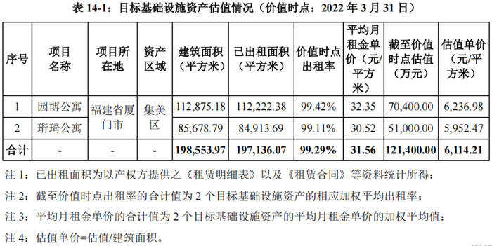 厦门安居集团目前项目共有24个,此次申报项目底层资产为集美区园博公寓和珩琦公寓项目。截至2022年3月31日,2 个目标基础设施资产估值合计 12.14 亿元,平均估值单价36,114.21 元/平方米。
