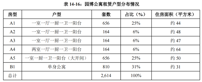 园博公寓于 2020 年 3 月竣工,由 7 栋钢混结构建筑物组成,共计 2,614 套房源,总建筑面积为 112,875.18 平方米。截至 2022 年 3 月 31 日,园博公寓出租率 99.42%,已出租部分加权平均月租金单价为 32.35 元/平方米/月(含税)。