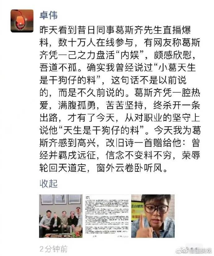 而在葛斯齐搅动内娱之时,前辈卓伟也为他作诗一首,要知道卓伟老师一般只为大明星作诗。“曾经并羁戌远征,信念不变料不穷,荣辱轮回天道定,窗外云卷卧听风。”卓伟在朋友圈中写道:葛斯齐凭一腔热爱,满腹孤勇,苦苦坚持,终杀开一条出路,才有了今天,从对职业的坚守上说他“天生是干狗仔的料”。