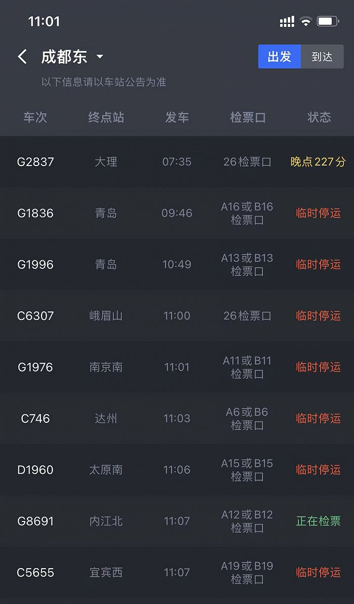 “掌上高铁”APP显示,截至今天上午11时,成都东站去往青岛、峨眉山、南京南、达州、太原南、宜宾西等地的列车,仍有临时停运的趟次。而从重庆、贵阳、南充、广安、广元等地到达成都东站的列车,也有部分趟次临时停运或晚点。成都西站去往邛崃、雅安的部分列车临时停运。