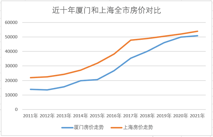 从2011年的1万出头到2021年的5万左右,这10年厦门房价的涨幅大概是5倍。