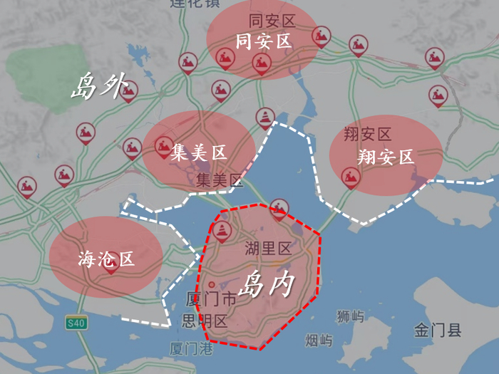 厦门岛内岛外全市6个区,岛内也就是思明、湖里两个区,岛外分别是集美、海沧、同安、翔安四个区。