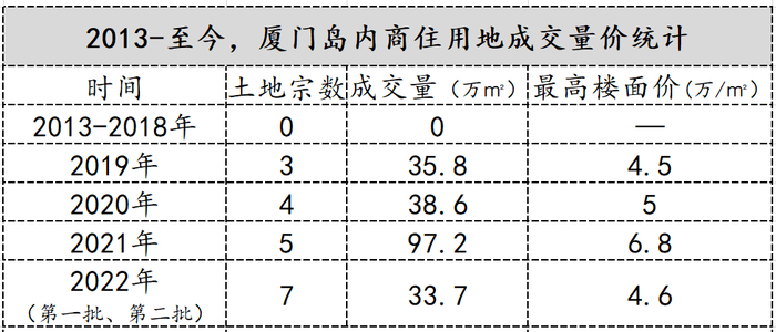 2021年,岛内的土地价格却一再刷新全市单价,近7万/平方米。为避免房价上涨的太厉害,2022年厦门部分地块采取“限房价、限地价、竞配建”方式出让: