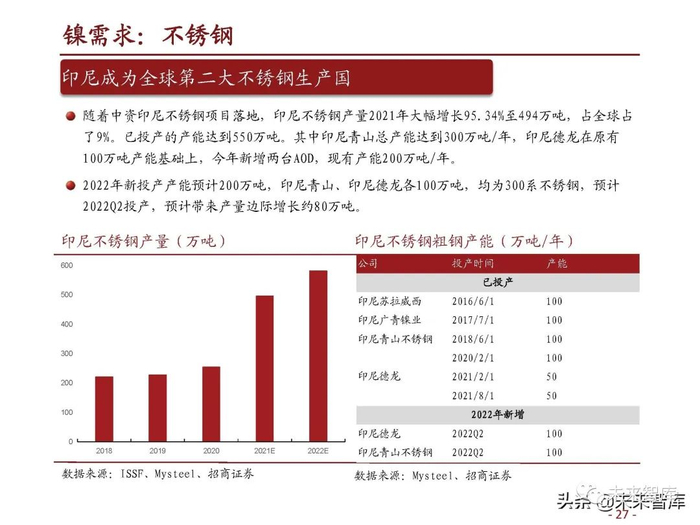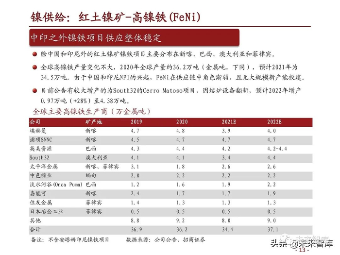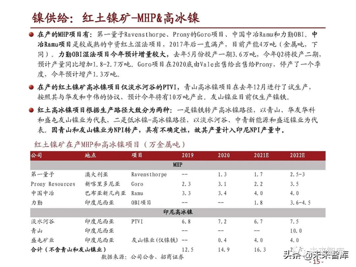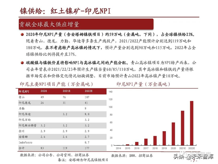 2020年印尼NPI产量(含安塔姆镍铁项目)约59万吨(金属吨,下同),占全球镍供给23%。 随着青山、德龙、力勤、华迪等多条生产线投产,2021/2022产能预计分别达到119万吨和 180万吨,在不考虑转产高冰镍的情况下,预计产量分别达到90万吨和115万吨,2022年占全 球镍供给比例将提升至37%。(报告来源:未来智库)