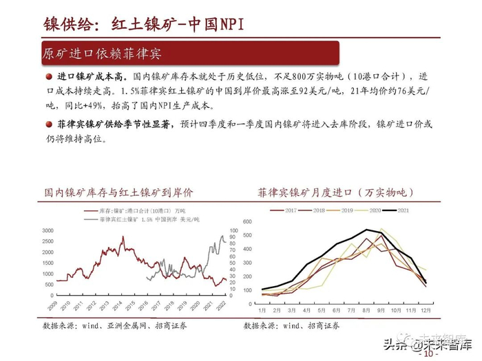 菲律宾镍矿供给季节性显著,预计四季度和一季度国内镍矿将进入去库阶段,镍矿进口价或 仍将维持高位。