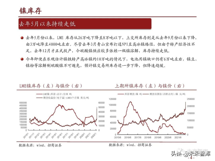 去年5月以来持续走低。去年5月份以来,LME 库存从26万吨下降至8万吨以下,上交所库存则是从去年9月份以来下降, 由3万吨降至4000吨左右。尽管去年3月青山宣布打通NPI至高冰镍路径,但由于转产经济性不 足,去年12月才正式投产,令硫酸镍供应较多依赖一级镍溶解,库存持续走低。今年即使在乐观估计镍铁转产高冰镍约10万吨的情况下,电池用镍缺口仍有6万吨左右,镍豆、 镍粉等溶解制硫酸镍不可避免,预计镍交易所库存进一步下降,但降速趋缓。
