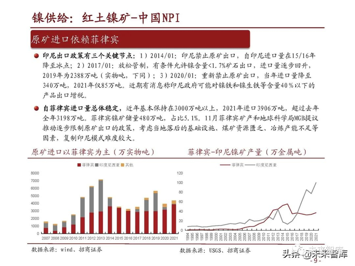 印尼出口政策有三个关键节点:1)2014/01:印尼禁止原矿出口,自印尼进口量在15/16年 降至冰点;2)2017/01:放松管制,有条件允许镍含量<1.7%矿石出口,进口量逐步回升, 2019年为2388万吨(实物吨,下同);3)2020/01:重新禁止原矿出口,当年进口量降至 340万吨,2021年仅85万吨。近期有消息称印尼政府可能对镍铁和镍生铁等含量40%以下的 产品出口增税。