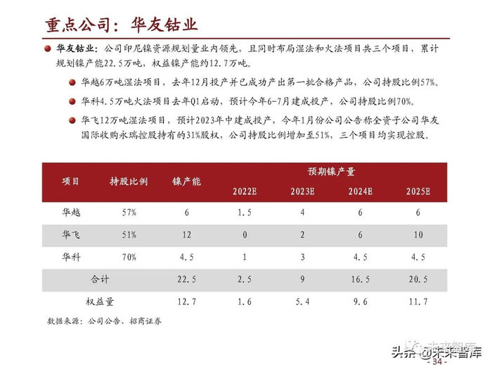 公司印尼镍资源规划量业内领先,且同时布局湿法和火法项目共三个项目,累计 规划镍产能22.5万吨,权益镍产能约12.7万吨。华越6万吨湿法项目,去年12月投产并已成功产出第一批合格产品,公司持股比例57%。华科4.5万吨火法项目去年Q1启动,预计今年6-7月建成投产,公司持股比例70%。华飞12万吨湿法项目,预计2023年中建成投产,今年1月份公司公告称全资子公司华友 国际收购永瑞控股持有的31%股权,公司持股比例增加至51%,三个项目均实现控股。