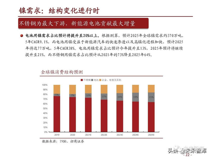 电池用镍需求占比预计将提升至20%以上。根据测算,预计2025年全球镍需求约370万吨, 5年CAGR9.1%,而电池用镍受益于新能源汽车的快速渗透以及高镍化进程加快,预计2025 年将达77万吨,5年CAGR38%。电池用镍需求占比预计今年提升至13%,2025年预计将继续 提升至21%,而不锈钢用镍需求占比预计从2021年的73%降至2025年64%。