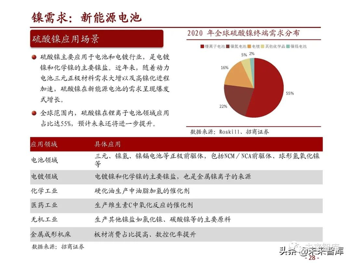 硫酸镍应用场景:硫酸镍主要应用于电池和电镀行业,是电镀 镍和化学镍的主要镍盐。近年来,随着动力 电池三元正极材料需求大增以及高镍化进程 加速,硫酸镍在新能源电池的需求呈现爆发 式增长。全球范围内,硫酸镍在锂离子电池领域应用 占比达55%,预计未来还将进一步提升。2020 年全球硫酸镍终端需求分布 数