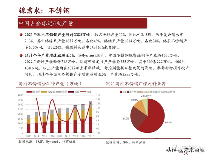 2021年国内不锈钢产量预计3385万吨,约占全球产量57%,同比+12.33%,两年复合增长率 7.3%。其中铬镍系产量1677万吨,占比49%,铬锰系产量1014万吨,占比30%,铬系不锈钢产 量675万吨,占比20%。镍原料来源中预计61%来自NPI。