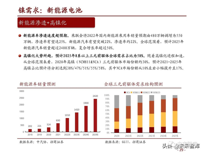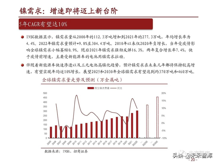 INSG数据显示,镍需求量从2000年的112.3万吨增加到2021年的277.3万吨,年均增长率为 4.4%。2022年镍需求量预计+9.8%至304.4万吨。2010年以来仅2020年负增长,当年受疫情影 响全球镍需求小幅萎缩0.9%。随后2021年镍需求强劲反弹16.3%,两年复合增长率7.4%,快 于疫情前增速,主要受新能源车的电池用镍需求拉动。伴随着新能源车快速渗透以及三元电池高镍化趋势,预计镍需求在未来几年都将保持较高增 速,有望实现年均近10%增长,展望2025和2030年全球镍需求有望达到约370万吨和460万吨。