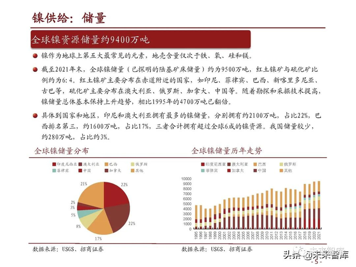 镍作为地球上第五大最常见的元素,地壳含量仅次于铁、氧、硅和镁。截至2021年末,全球镍储量(已探明的陆基矿床储量)约为9500万吨,红土镍矿与硫化矿比 例约为6:4。红土镍矿主要分布在赤道附近的国家,如印尼、菲律宾、巴西、新喀里多尼亚、 古巴等,硫化矿主要分布在澳大利亚、俄罗斯、加拿大、中国等。随着勘探和采掘技术提高, 镍储量总体基本保持上升趋势,相比1995年的4700万吨已翻倍。具体到国家和地区,印尼和澳大利亚拥有最多的镍储量,分别拥有约2100万吨,占比22%,巴 西排名第三,约1600万吨,占比17%,三者合计拥有超过全球6成的镍资源。我国储量较少, 约280万吨,占比约3%。
