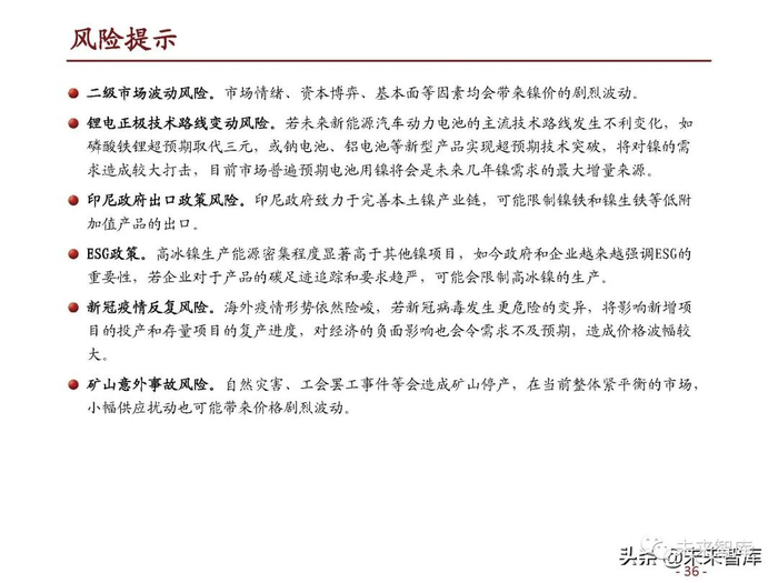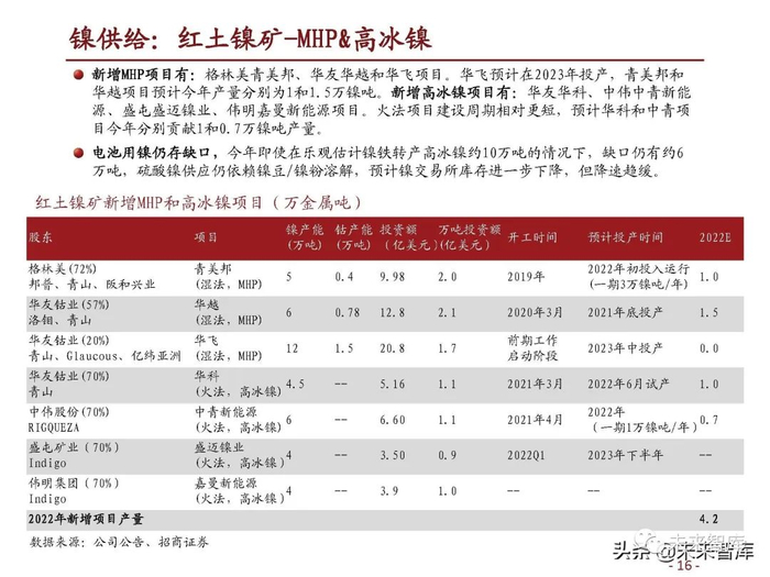 下拓材料:公司计划在贵州投建新能源材料项目,以镍铁、高冰镍、镍精矿、粗制氢氧化 钴为原料,生产包括电池级硫酸镍、硫酸钴、四氧化三钴等产品,其中电池级硫酸镍规划 量为6.8万金属吨,作为印尼镍项目的下游。(报告来源:未来智库)