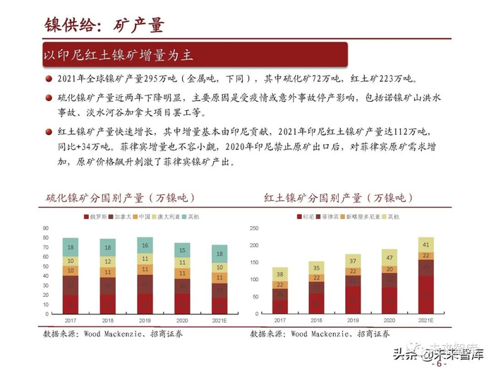 2021年全球镍矿产量295万吨(金属吨,下同),其中硫化矿72万吨,红土矿223万吨。硫化镍矿产量近两年下降明显,主要原因是受疫情或意外事故停产影响,包括诺镍矿山洪水 事故、淡水河谷加拿大项目罢工等。红土镍矿产量快速增长,其中增量基本由印尼贡献,2021年印尼红土镍矿产量达112万吨, 同比+34万吨。菲律宾增量也不容小觑,2020年印尼禁止原矿出口后,对菲律宾原矿需求增 加,原矿价格飙升刺激了菲律宾镍矿产出。