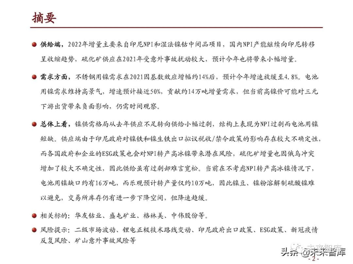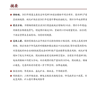 供应方面,预计今年原生镍产量+14%至311万吨(金属吨,下同),其中以印尼NPI(+25万吨) 和湿法镍钴中间品/高冰镍项目(+10万吨)为主,国内NPI产量预计进一步下滑(-5.7万吨), 硫化矿精炼镍供应在2021年受意外事故扰动较大,今年预计小幅增加(+4.2万吨),但俄乌冲 突令增量不及预期的风险加剧。
