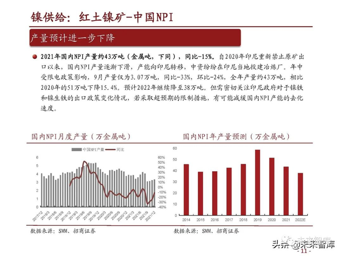 2021年国内NPI产量约43万吨(金属吨,下同),同比-15%。自2020年印尼重新禁止原矿出 口以来,国内NPI产量逐渐下滑,产能向印尼转移,中资纷纷在印尼当地投建冶炼厂。年中 受限电政策影响,9月产量仅为3.07万吨,同比-33%,环比-24%,全年产量约43万吨,相比 2020年的51万吨下降15.4%。预计2022年继续降至38万吨。但需密切关注印尼政府对于镍铁 和镍生铁的出口政策变化情况,若采取超预期的限制措施,有可能减缓国内NPI产能的去化 速度。