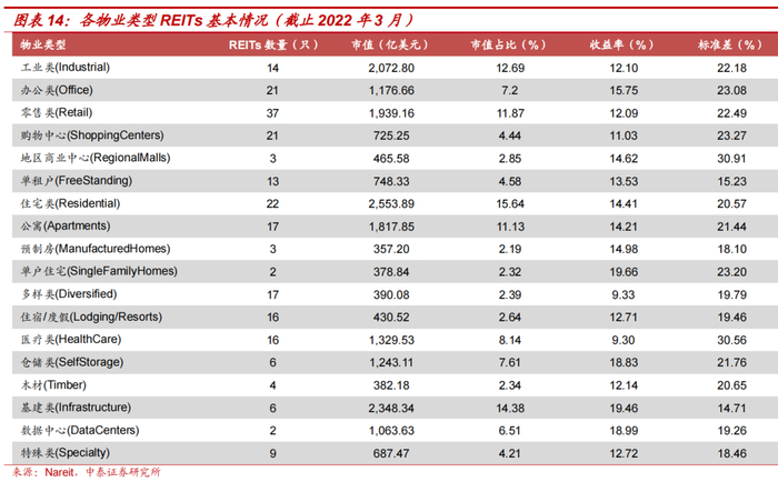 REITs不仅投资于住宅、办公和零售物业,也还投资于更多更广阔的物业形态。REITs在美国可以投资并持有多种不同的物业形态,包括公寓小区、购物中心、写字楼、工业仓储、餐饮酒店、健康护理设施以及其他种类的物业。以下图表是底层资产为不同物业类型的美国权益型REITs基本情况。