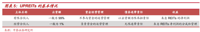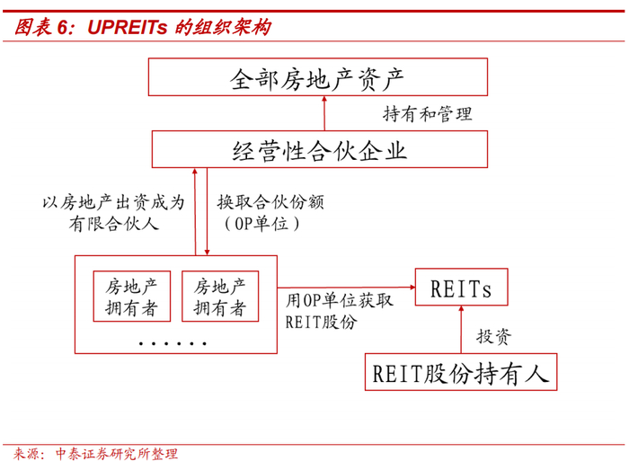 5)更容易达成法律规定。REITs在法律上有“5人以下持有的REITs股份不得超过50%”的规定。这对于公司制REITs是一个难题,而UPREITs则很容易达成。