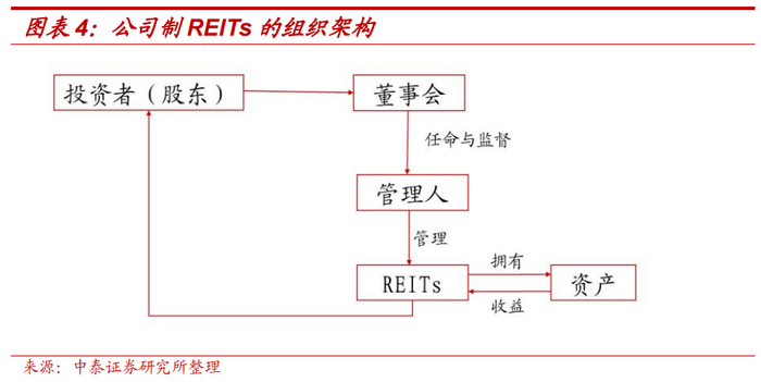 公司型REITs是通过发行股份的方式募集资金成立投资公司,具有法人资格。股份持有人既是公司型REITs的投资者,又是公司股东,依照法律和公司章程的规定享受权利,承担义务。投资人为公司股东,拥有了公司事项的重大决策权,可以选出董事会成员来代表其利益行事,并获得公司分红,与公司制REITs形成股东和公司的关系。而投资人出资形成的资产由REITs公司所有,一般由投资人选出的董事会进行持有,并代表投资人行事。