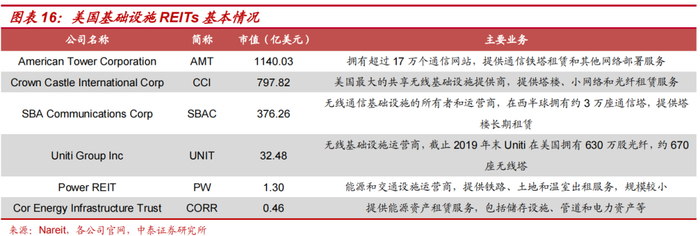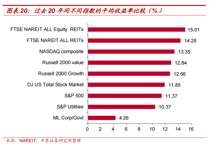 除了以上传统物业,近年来基础设施和数据中心也纳入REITs物业范畴。由于美国基础设施REITs主要位于无线通讯行业,因此高收益与近些年通讯行业高速发展有关,伴随各REITs公司纷纷布局5G,预计未来高收益还将延续。