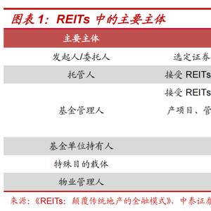 REITs中的主要主体有发起人/委托人、托管人、基金管理人、基金单位持有人、特殊目的载体和物业管理人。