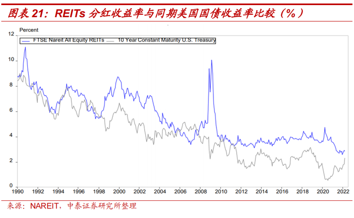 将REITs与同期美国十年期国债收益率对比,发现在1990年-2022年间,绝大部分时间REITs的分红收益率表现明显优于同期国债。由于有实体经济保障,多数时候REITs派息率波动幅度小于国债收益率,2008年出现大幅波动主要由股价下跌所致。