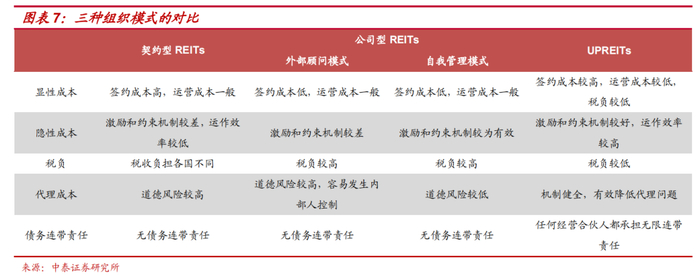 以上三种模式是REITs的主要组成模式,三种组织模式的比较如下: