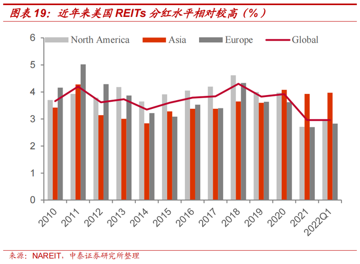 过去十年全球REITs收益率均值为10.27%,美国作为最成熟的REITs市场,其产品收益水平相对亚洲和欧洲更高;分种类来看,权益型表现优于抵押型。REITs总收益由资本利得和分红派息两部分构成,不同于股价的较高波动性,REITs派息比率长期稳定在3%到5%之间,且各地区差异不大,说明投资者持有期间现金流有保障。