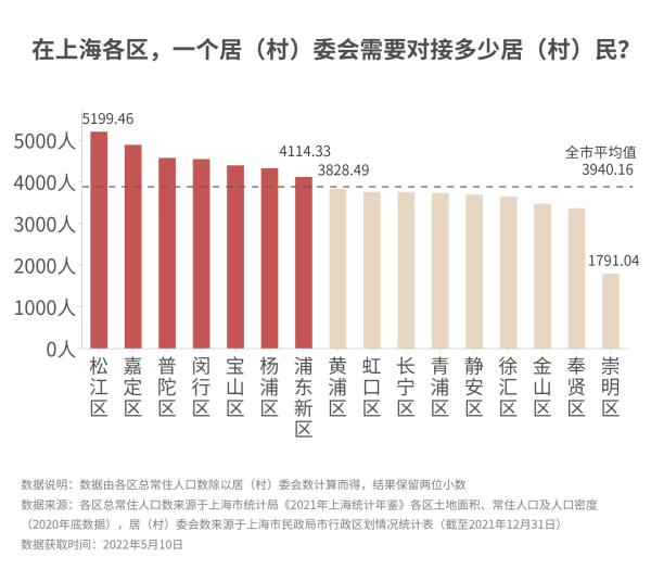 我国《居民委员会组织法》规定,居民委员会一般在100户至700户的范围内设立,由主任、副主任和委员5至9人组成。根据常住人口及居村委会个数的最新数据,可以粗略计算出,上海市一个居(村)委会平均需对接约3940名居民,在松江区这个数字甚至达到了5199。