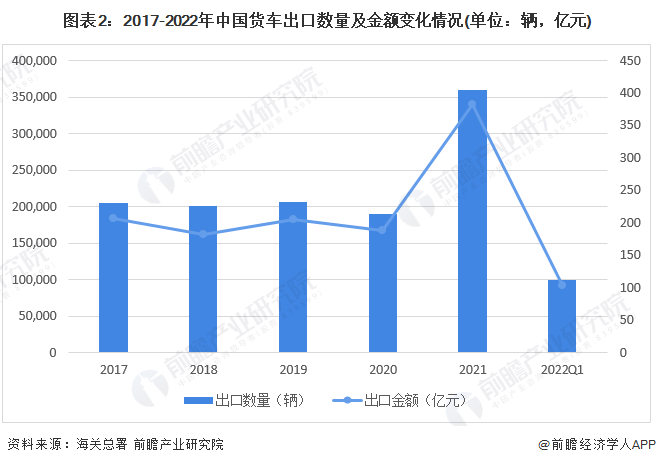 2017-2020年,中国货车出口量在20万辆左右波动,变动幅度不大;2021年受全球疫情放缓,各国复工复产,加大基建投资的影响,我国货车出口量激增至36万辆,接近2020年出口量的两倍,出口金额也突破380亿元。2022年第一季度,中国货车出口量约为10万辆,出口金额达到102亿元。