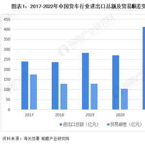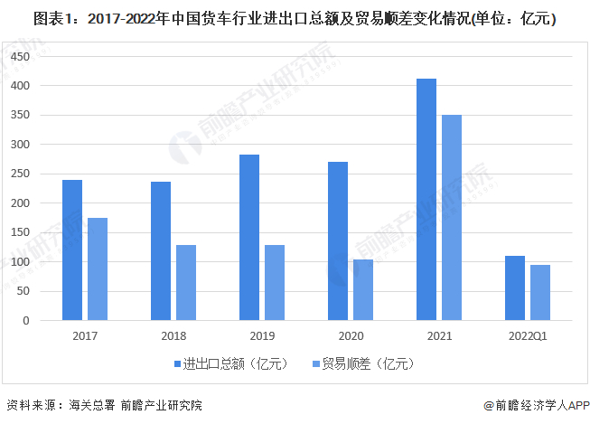 2017-2021年,中国货车行业进出口总额呈波动上升态势,2021年,中国货车行业进出口总额突破400亿元,同比上升约52%;贸易顺差也达到了350亿元。2022年第一季度,中国货车行业进出口总额为110亿元,贸易顺差达到了95亿元。