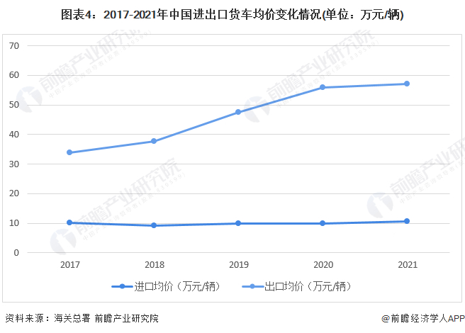 2017-2021年中国出口货车均价在10万元左右波动,变化幅度不大,而进口货车均价则呈现逐年上升趋势,从2017年的34万元攀升至2021年的57万元;总体来看,我国货车行业进出口均价差距较大,说明我国货车出口以低端车型为主,产品附加值较低。