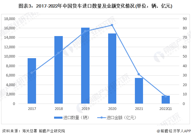 2017-2021年,中国货车进口量呈现先增后减的态势,其中2019年进口数量达到顶峰,2020年进口金额达到顶峰;2021年,中国货车进口数量骤降至5452辆,降幅超过60%。2022年第一季度,货车进口量为1723辆,进口金额约为8亿元。
