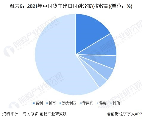 从货车出口国家来看,2021年中国货车出口数量前五的国家分别为智利、越南、澳大利亚、菲律宾和秘鲁,其中出口到智利的货车数量达到了5.8万辆,占总出口货车数量的16%;出口数量排名前五的国家累计占比为40%,且分布在大洋洲、亚洲和南美洲三个大洲,反映出我国货车出口市场较为分散。