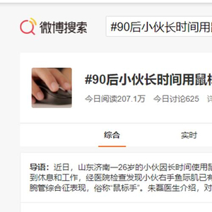 近日,山东济南一名26岁的小伙儿因长时间使用鼠标,出现了右手手指麻木和腕关节疼痛等症状,已影响到休息和工作。经医生检查发现,小伙儿右手鱼际肌已有萎缩,拇指、食指、中指三个手指的感觉减退,符合腕管综合征表现,也就是俗称的“鼠标手”。