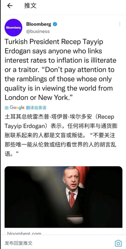 当时,面对土耳其国内里拉汇率暴跌和通胀高企,这位新时代的苏丹不按惯常的套路出牌——通过加息的方式来对抗通胀,而是反其道而行之,不断降息。