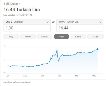 如今土耳其里拉兑美元的汇率,已经到了16.44,今年以来已经跌去了20%。