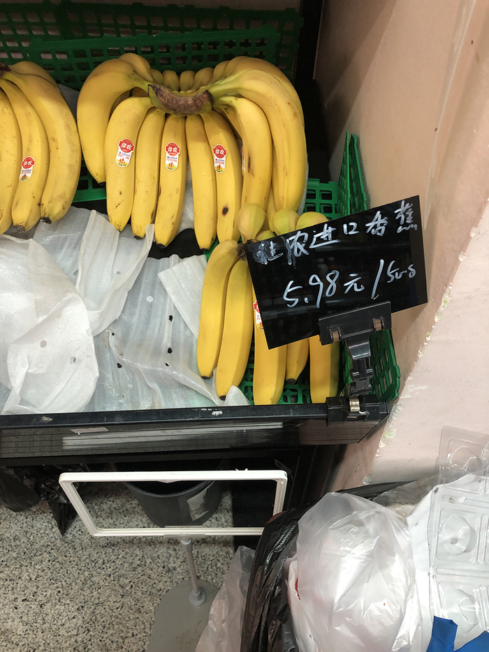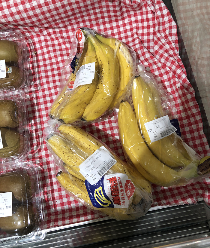 6月2日,绿地臻选超市,价签显示佳农香蕉49.8元/公斤,折合24.9元/斤。