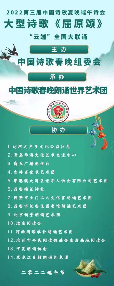 受疫情影响,2022第三届中国诗歌夏晚端午诗会采用线上“云”模式。来自全国各地的十五个优秀诗歌朗诵团队线上联诵了大型史诗巨作《屈原颂》。