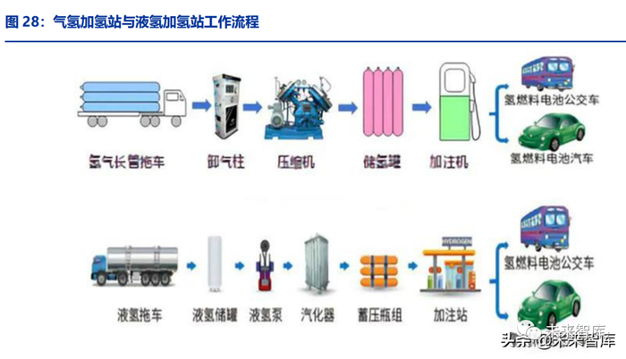 气氢加氢站主要包括卸气柱、压缩机、储氢罐、加氢机、管道、控制系统、氮气吹扫 装置、放散装置以及安全监控装置等等。其中最为核心的设备为压缩机、储氢罐以及加氢 机。液态加氢站是由液氢储罐、高效液氢增压泵、高压液氢气化器及氢气储罐、加氢机和 控制系统等关键模块组成。其中液氢泵是液氢加氢站的核心设备,液氢泵相较于气氢加氢 站中的压缩机,能耗降低 80%~90%。