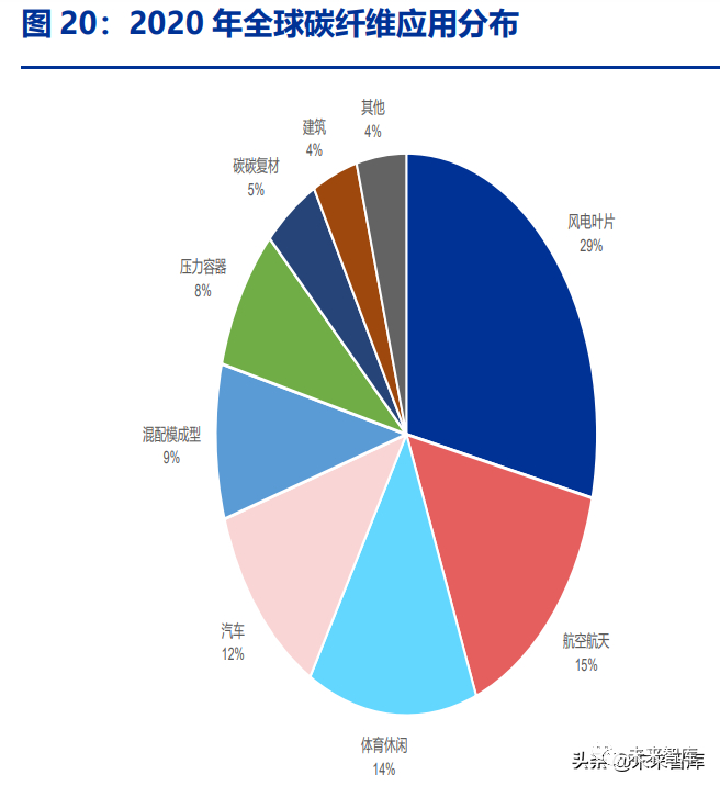 碳纤维行业存在明显的供不应求特征,国产化正提速。2020 年中国碳纤维总需求为 48851 吨,其中国产量仅 18500 吨,预计 2025 年我国碳纤维需求约为 15 万吨,2025 年全球碳纤维需求约为 20 万吨, 2030 年全球碳纤维需求约为 40 万吨。2020 年国产 18500 吨销量,相比 2019 年的 12000 吨,增长率为 54.2%,并且连续四年增长率超过 30%。应用方面,风电叶片为最主要的应 用,占比超过 40%,高压储氢罐应用仅占 4%。