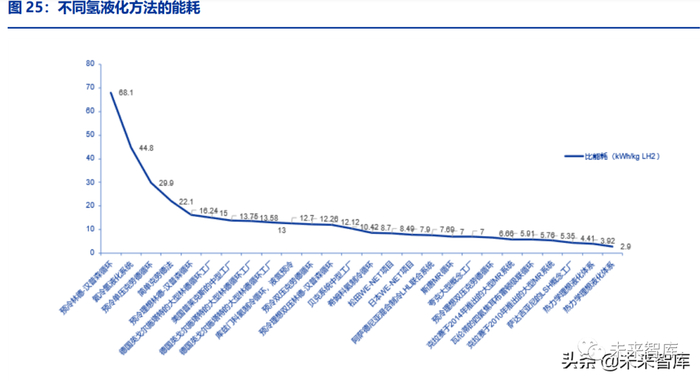 氢气液化能耗下降空间巨大。理想状态下,氢气液化耗能为 3.92kWh/kg,然而实际 生产过程中却无法达到。目前的氢气液化主要是通过液氮冷却和压缩氢气膨胀实现,耗能 为 13~15kWh/kg,几乎是氢气燃烧所产生低热值(产物为水蒸气时的燃烧热值,33.3 kW h/kg)的一半,而氮气的液化耗能仅为 0.207kW h/kg,因此降低氢气液化耗能至关重要。一个有效的方法就是扩大液氢的制备规模,通过大规模设备,可以将氢气液化能耗降低到 5~8kWh/kg;调整工艺也是一个有效方法,比如欧洲联盟的 IDEALHY 项目使用 He-Ne 布雷顿法制备液氢,能耗为 6.4kW h/kg。另外,发达国家正通过创新氢液化流程和提高设 备工艺及效率的方法,提高氢液化装置的效率和降低能耗。一些采用高性能换热器、膨胀 机和新型混合制冷剂的氢液化创新概念流程的能耗最低已至 4.41kWh/kg。