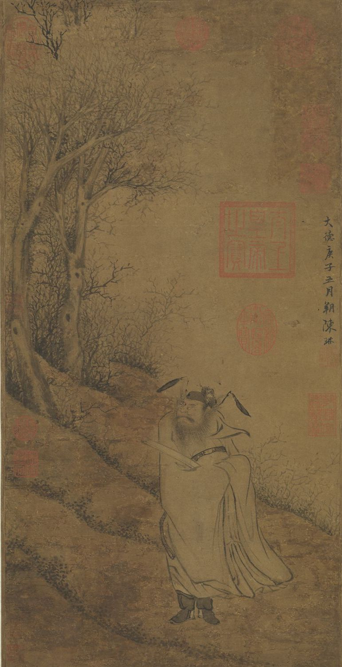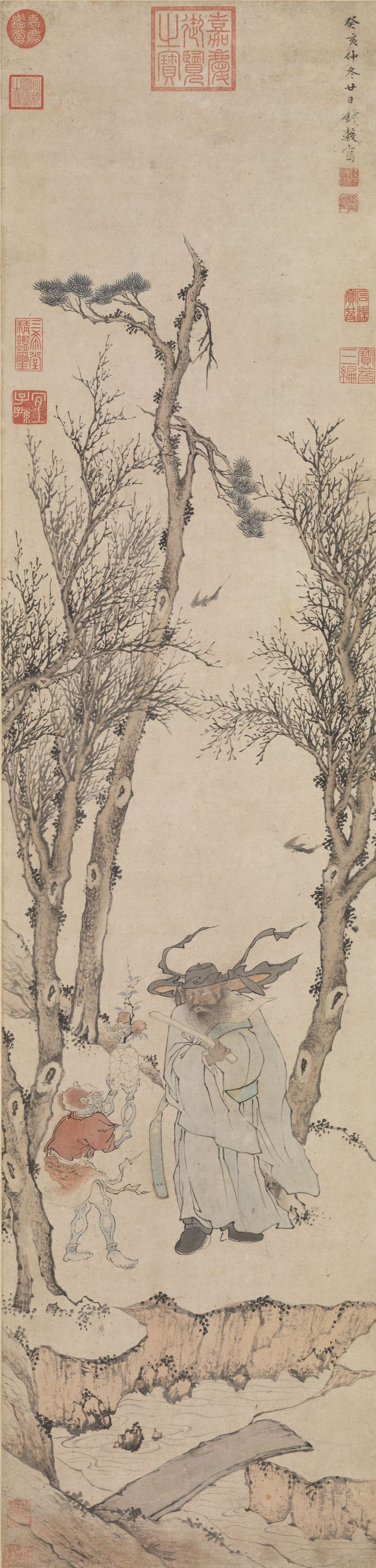 本幅著录于《秘殿珠林续编》。画坡坨林木,钟馗执笏回首,布局与文征明“寒林钟馗”相近,惟技艺略逊一筹,应属明代画家托名之作。