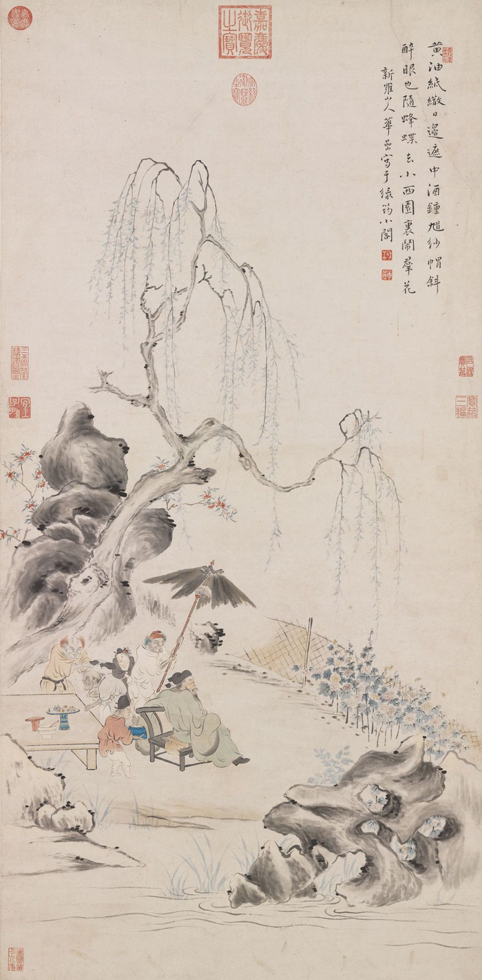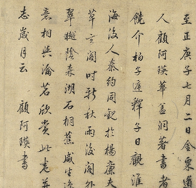 顾瑛:行书跋至正庚子(1360)七月二日,金粟道人顾阿瑛。华盖洞著书者饶介,柏子庭释子日观,淮海后人秦约,同观于杨廉夫草玄阁,时新秋雨后,阁外翠樾阴森,湖石桐蕉,咸生凉意,相与瀹茗欣赏此卷,并志岁月云,顾阿瑛书。