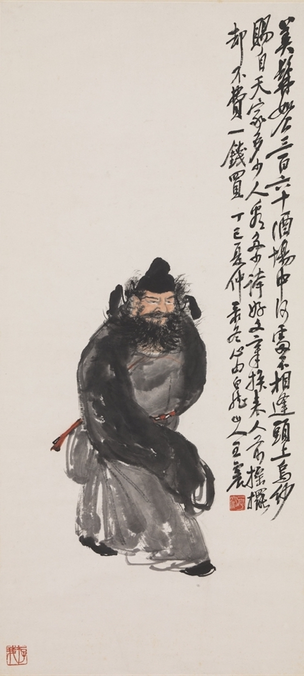 王震行书题:美须如公,三百六十酒场中,何处不相逢。头上乌纱,赐自天家,多少人看多少夸。好文章,换来人前摇摆,却不费一钱买。丁巳(西元一九一七年)夏仲录冬心句。白龙山人。