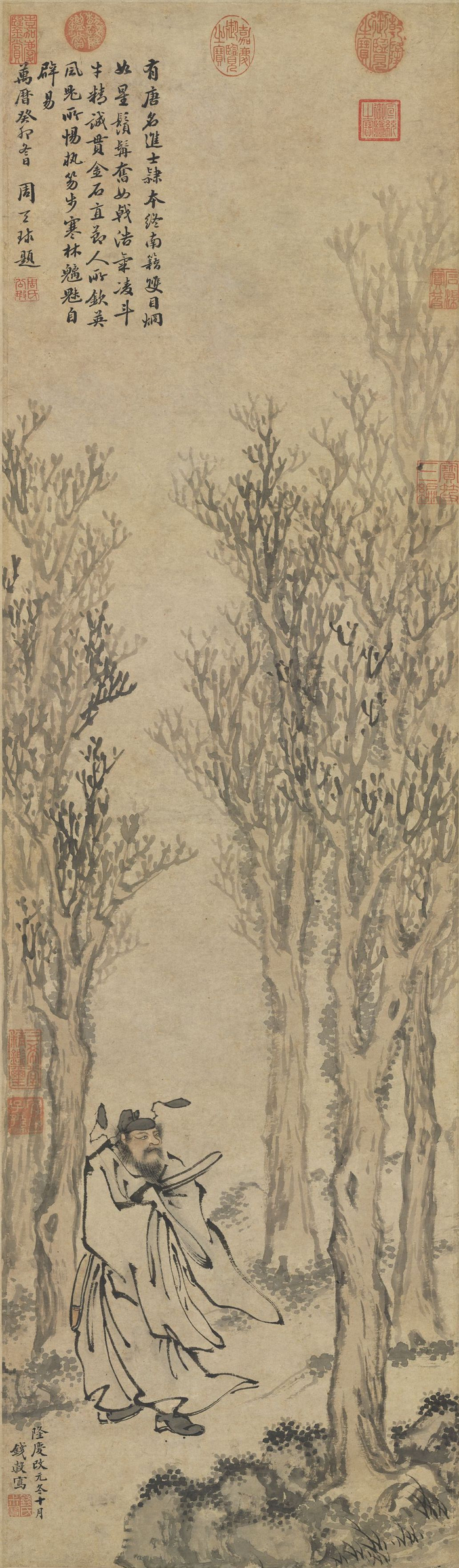 周天球行楷书跋:有唐名进士,隶本终南籍,双目烱如星,须髯奋如戟,浩气淩斗牛,精诚贯金石,直节人所钦,英风鬼所惕,执笏步寒林,魑魅自辟易。万历癸卯冬日。周天球题。(传)清世祖 画钟馗 轴